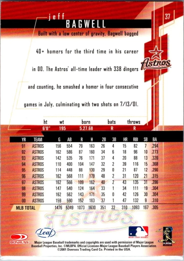 This is a nice example of a 2001 Leaf Rookies & Stars #37 Jeff Bagwell