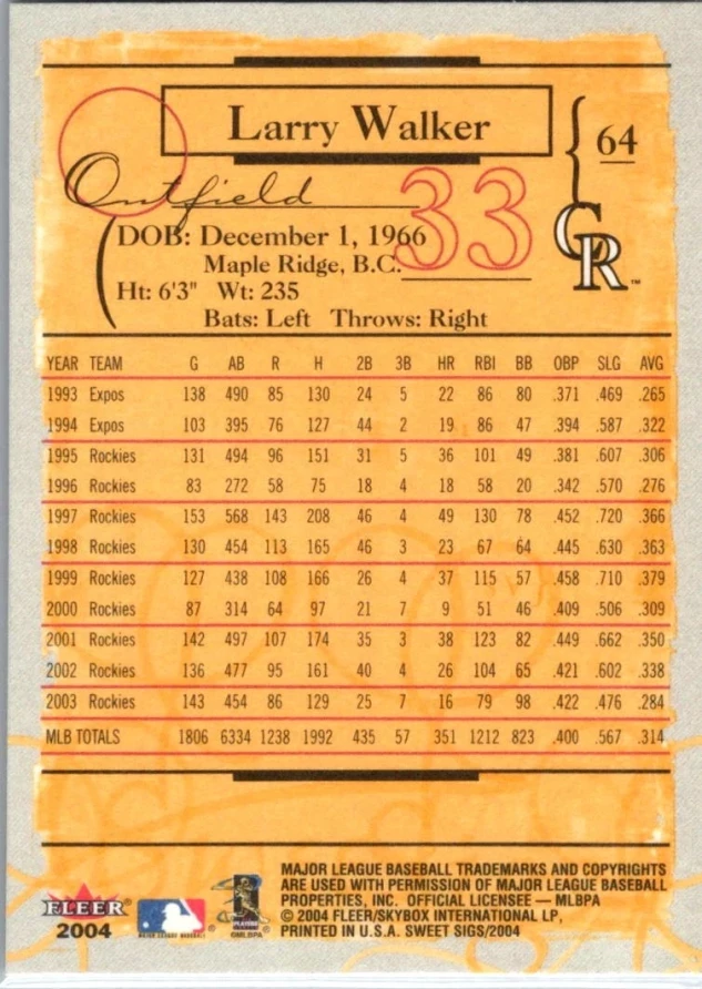 This is a nice example of a 2004 Fleer Sweet Sigs #64 Larry Walker