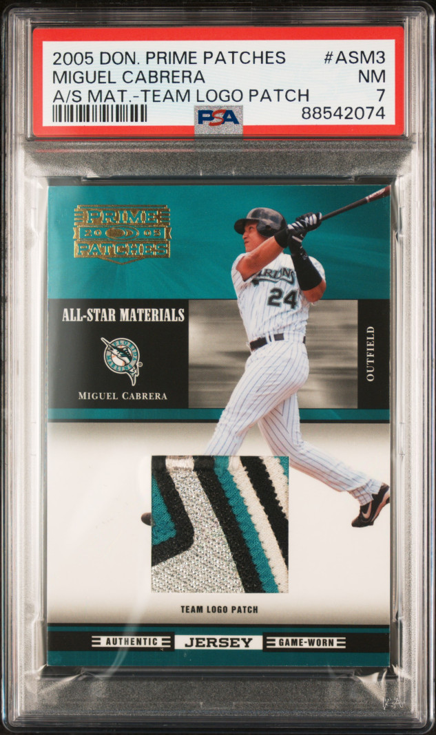 The product is a 2005 Donruss Prime Patches Name Plate Patch card featuring Miguel Cabrera from the Florida Marlins and graded PSA 7. This sports trading card is a special edition parallel variety with a limited print run of /55. The card is serial numbered and includes a patch of game-used memorabilia from the player, making it a highly collectible item for fans of Major League Baseball and sports trading cards.