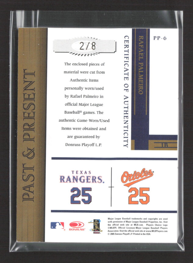 You are purchasing a 2005 Donruss Prime Patches Past & Present Rafael Palmeiro #PP-6 2/8 Sleeve Patches Authentic Game-Worn Jerseys. You will receive the exact item in the photographs. Thank you for looking.