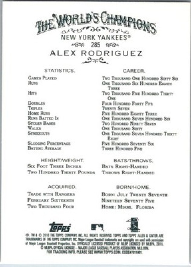 This is a nice example of a 2010 Topps Allen & Ginter #285 Alex Rodriguez