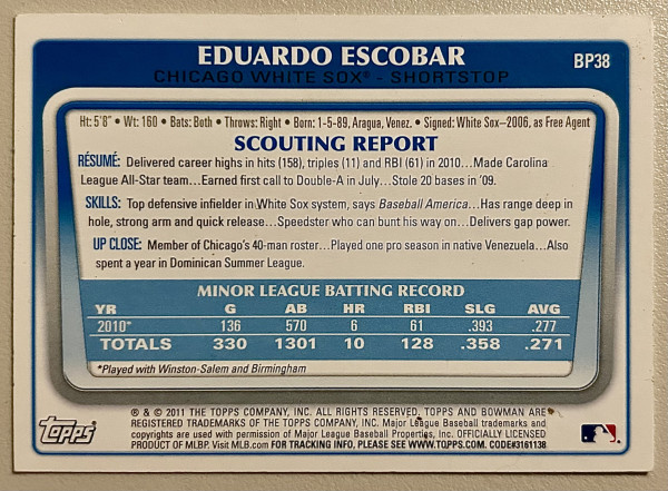 2011 Bowman Chrome Eduardo Escobar FIRST BOWMAN CARD #BCP38 - Chicago White Sox