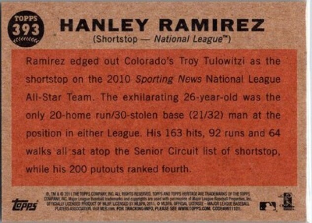 This is a nice example of a 2011 Topps Heritage #393 Hanley Ramirez