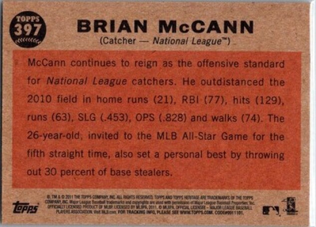 This is a nice example of a 2011 Topps Heritage #397 Brian McCann