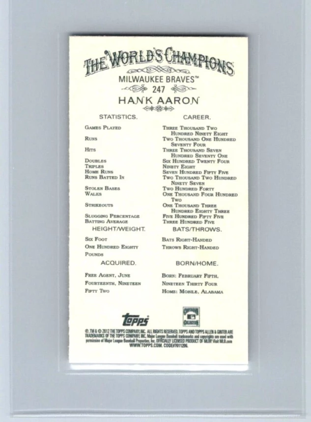 This is a nice example of a 2012 Topps Allen & Ginter #247 Hank Aaron Mini