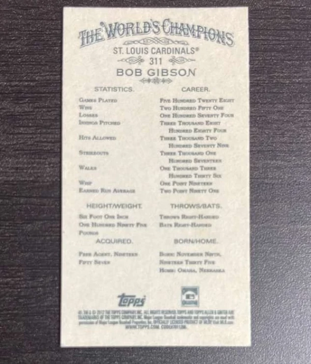 This is a nice example of a 2012 Topps Allen & Ginter - Mini Gold Border #311 Bob Gibson