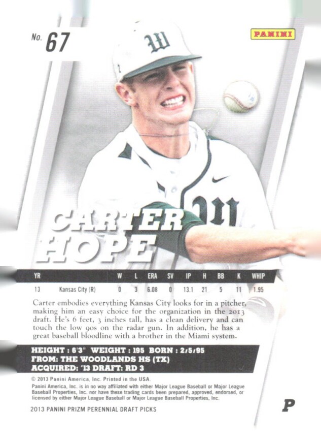 You are purchasing a 2013 Panini Prizm Perennial Draft Picks Carter Hope #67. You will receive the exact item in the photographs. Thank you for looking.