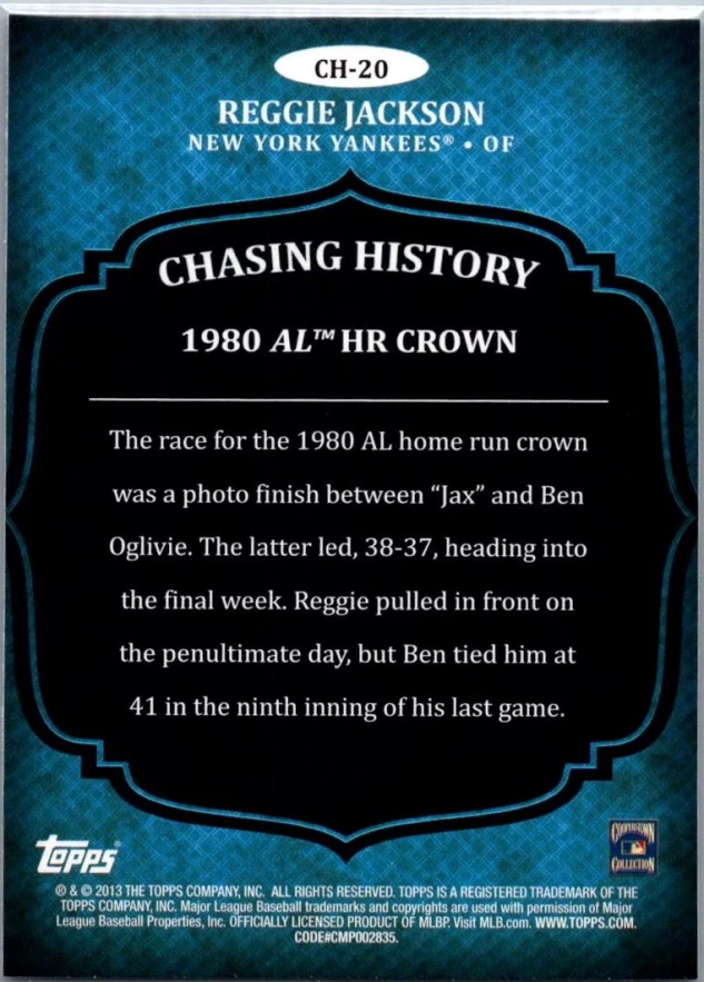 This is a nice example of a 2013 Topps #CH-20 Reggie Jackson Chasing History