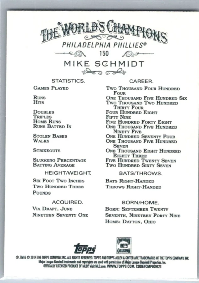 This is a nice example of a 2014 Topps Allen & Ginter #150 Mike Schmidt