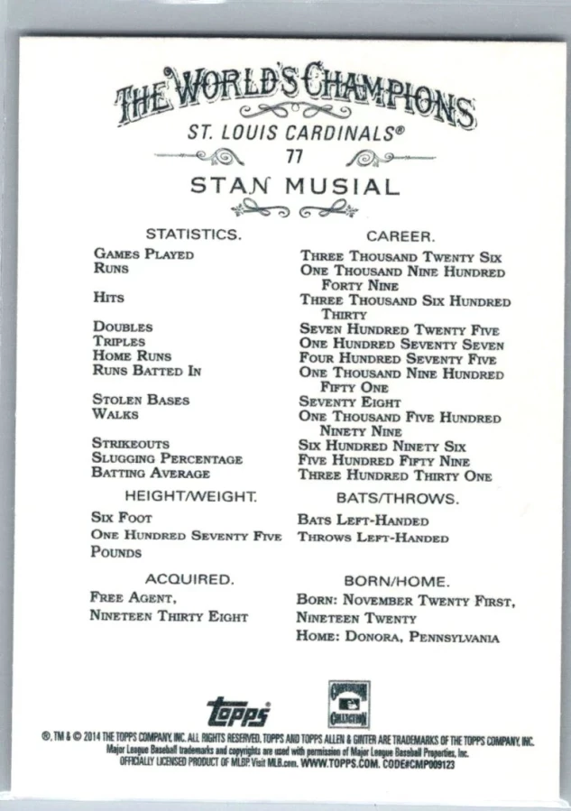 This is a nice example of a 2014 Topps Allen & Ginter #77 Stan Musial