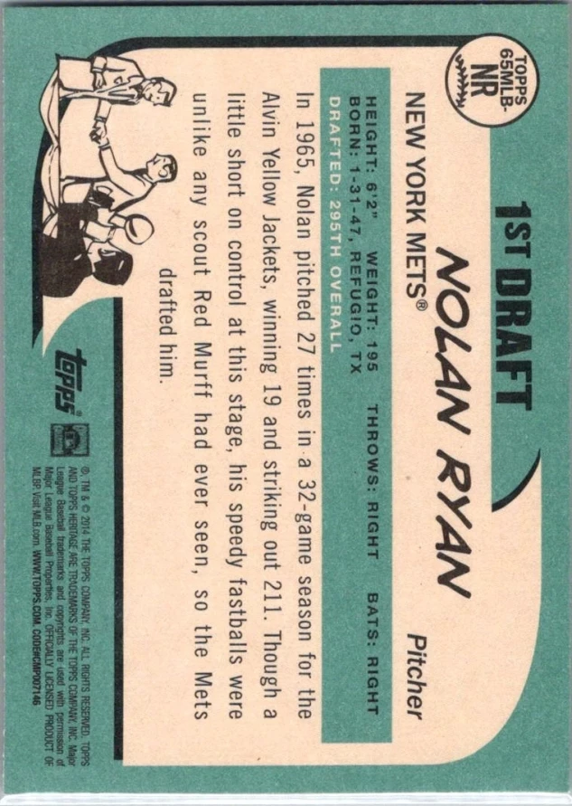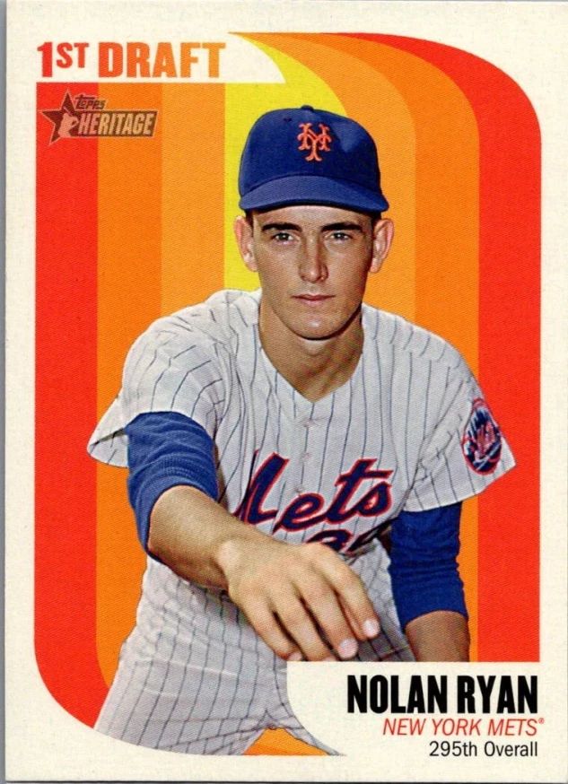 This is a nice example of a 2014 Topps Heritage #65MLB-NR Nolan Ryan 1st Draft