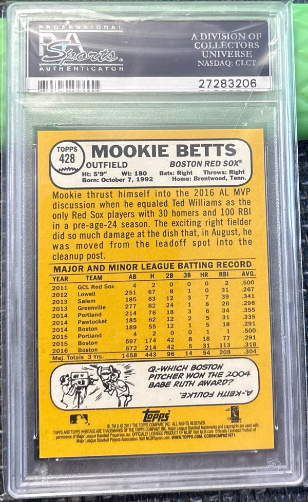 Up for sale is a Mookie Betts 2017 Topps Heritage #428 Action Variation. Professionally Graded by PSA, 10 Gem Mint. Population of just 70