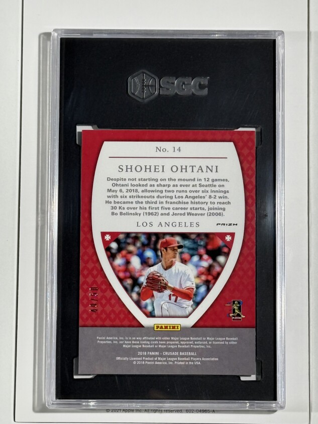 This is a rare and highly sought-after Shohei Ohtani 2018 Panini Prizm Crusade Green Prizm RC trading card, with a print run of only 50. The card features the talented athlete in his Los Angeles Angels uniforms, currently with the Los Angeles Dodgers. This card is a great addition to any collection, especially for fans of baseball and Shohei Ohtani himself. It is a rookie card and part of the 2018 Panini Prizm baseball set, making it a valuable and unique item. It has been professionally graded by SGC at a 9.5 Mint+ level, ensuring its authenticity and quality. A few of Shohei Ohtani's accolades 50/50 Club, 2x MLB World Series Champion, 4x MLB MVP, currently the only baseball player in MLB history with 3 home runs and record 10 strikeouts in the same game! Don't miss your chance to own this amazing piece of MLB history.