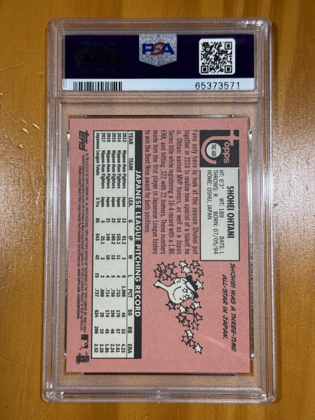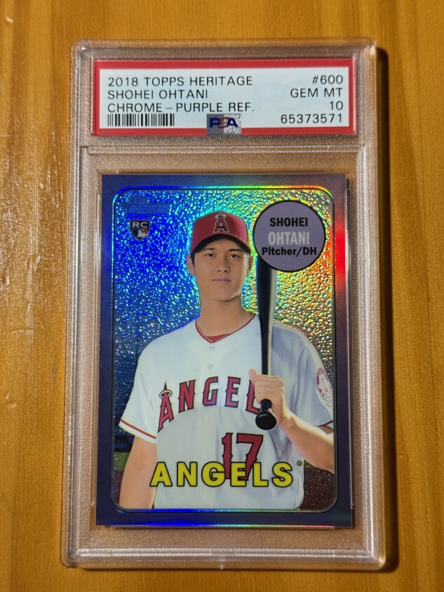 Elevate your collection with the 2018 Topps Heritage Chrome Shohei Ohtani Purple Refractor Rookie Card #THC-600 PSA 10. This high-grade card, professionally graded by PSA with a perfect score of 10, captures the two-way sensation in his debut season. As a standout piece from the 2018 Heritage Chrome High Number set, it’s a must-have for fans and collectors alike.Featuring a stunning chrome purple refractor finish, this card is a testament to Ohtani's remarkable talent and potential. A few accolades 50/50 Club, 2x MLB World Series Champion, and 4x MLB MVP; currently the only baseball player in MLB history with 3 home runs and record 10 strikeouts in the same game! Shohei Ohtani was signed by the Los Angeles Angels and is currently playing for the Los Angeles Dodgers.This card is a unique addition to any MLB memorabilia collection, celebrating a remarkable player. Don't miss your chance to own this amazing piece of MLB history.