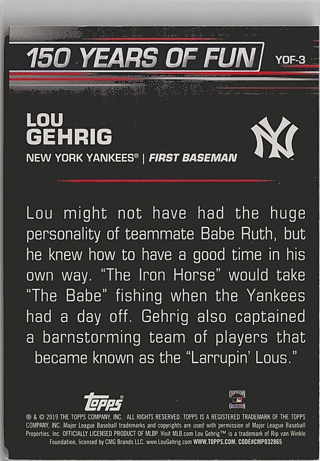 You are purchasing a 2019 Topps Opening Day Lou Gehrig #YOF-3 150 Years of Fun. You will receive the exact item in the photographs. Thank you for looking.