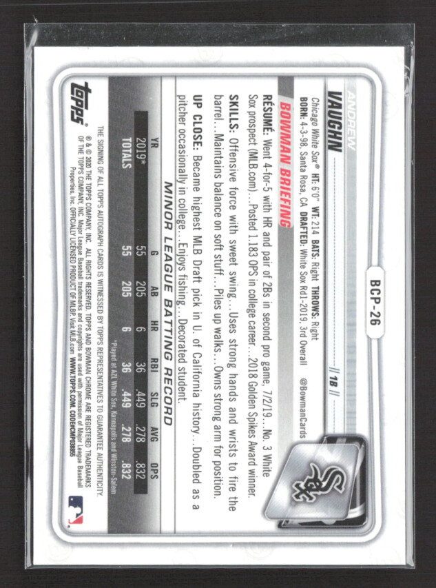 You are purchasing a 2020 Bowman Chrome Andrew Vaughn #BCP-26 Mojo Refractor. You will receive the exact item in the photographs. Thank you for looking.