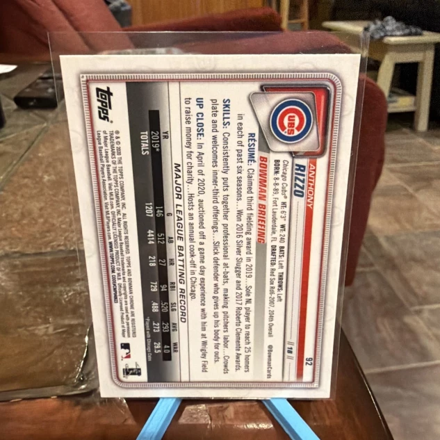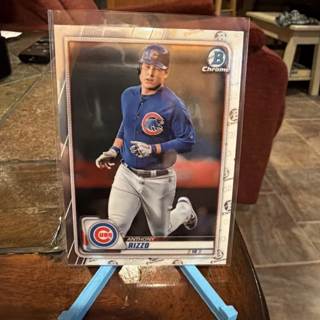 The product is a standard-sized 2020 Bowman Chrome trading card featuring Anthony Rizzo of the Chicago Cubs. This original card is made of card stock and is a part of the base set for the 2020 season. Manufactured by Topps, it is a licensed MLB trading card in English language. It is a popular choice among baseball card collectors for fans of Anthony Rizzo and the Chicago Cubs team.