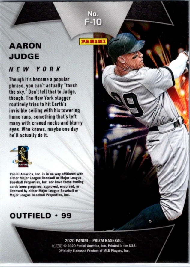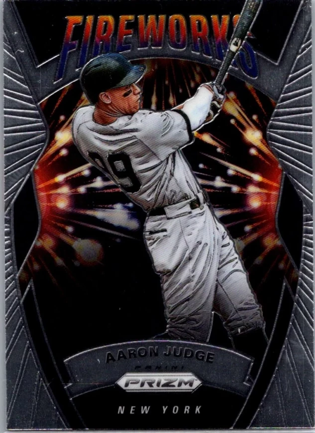 This is a nice example of a 2020 Panini Prizm #F-10 Aaron Judge Fireworks