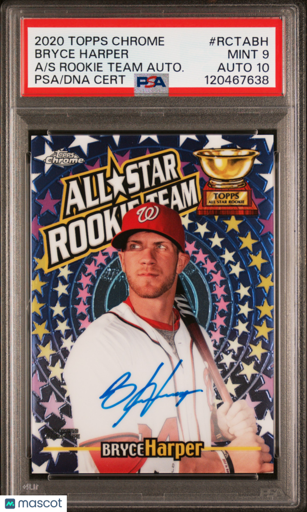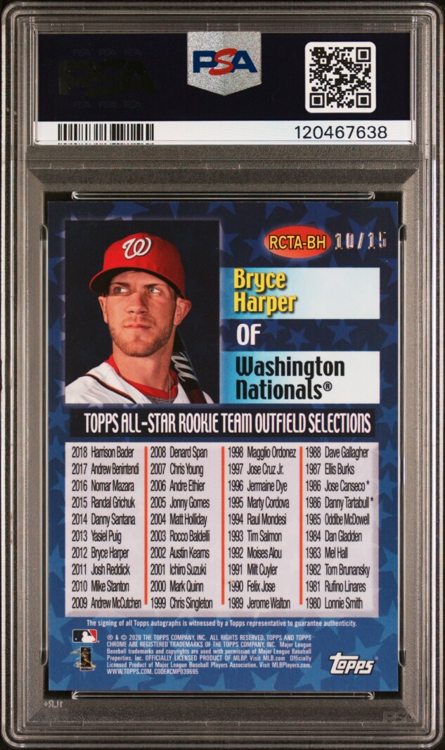 You are purchasing a 2020 Topps Chrome All-Star Rookie Team Autographs Bryce Harper #RCTABH 10/15 PSA 9 Auto 10. You will receive the exact item in the photographs. Thank you for looking.