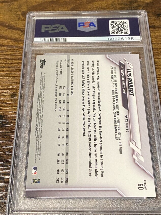You are purchasing a 2020 Topps Chrome Luis Robert #60 Chrome PSA 10. You will receive the exact item in the photographs. Thank you for looking.