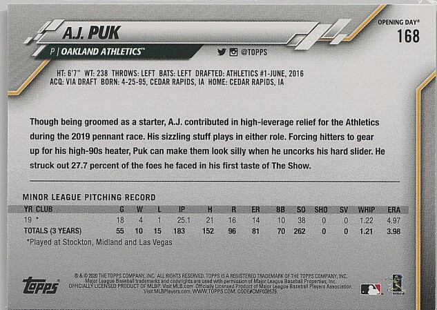 You are purchasing a 2020 Topps Opening Day A.J. Puk #168 RC. You will receive the exact item in the photographs. Thank you for looking.