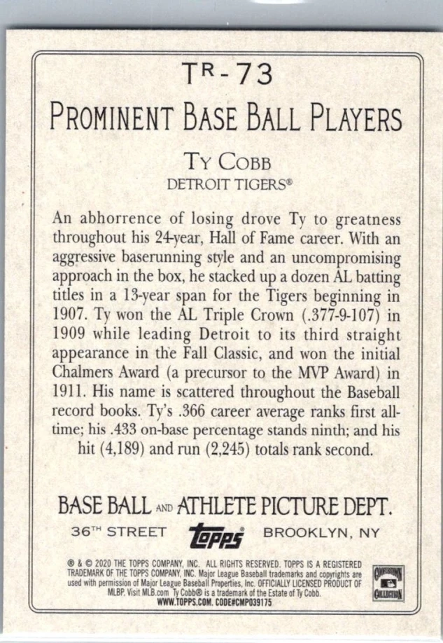 This is a nice example of a 2020 Topps #TR-73 Ty Cobb Turkey Red 2020 (Series 2)