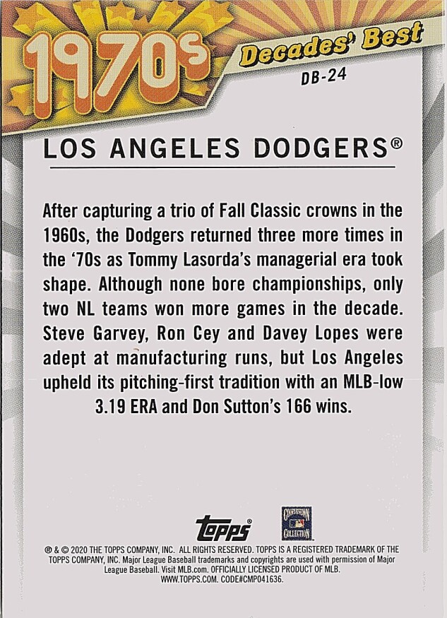 You are purchasing a 2020 Topps Update Los Angeles Dodgers #DB-24 Decades' Best. You will receive the exact item in the photographs. Thank you for looking.