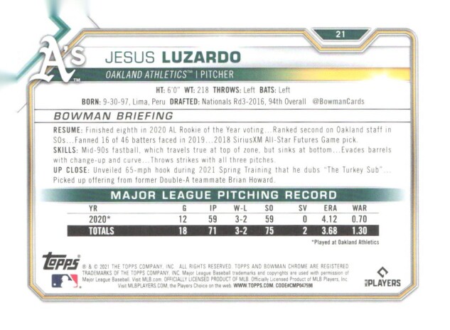 You are purchasing a 2021 Bowman Chrome Jesus Luzardo #21. You will receive the exact item in the photographs. Thank you for looking.