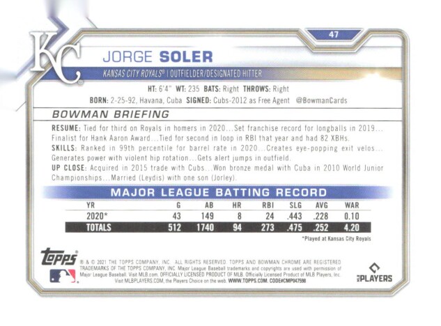 You are purchasing a 2021 Bowman Chrome Jorge Soler #47. You will receive the exact item in the photographs. Thank you for looking.