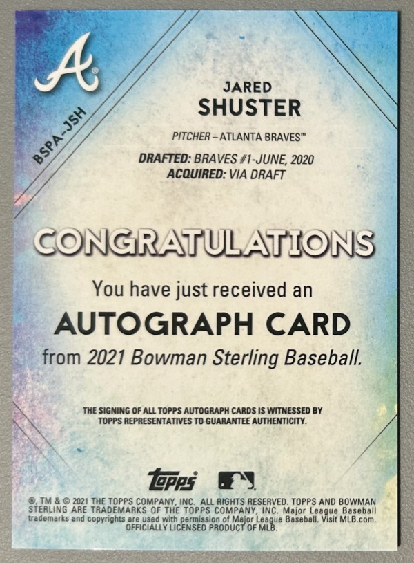 2021 Bowman Sterling Jared Shuster Auto Atlanta Braves #BSPA-JSH
