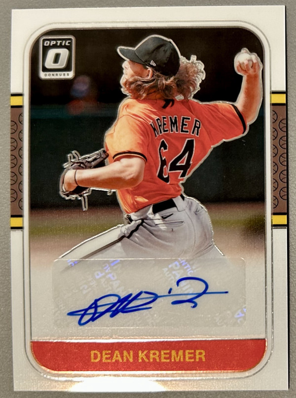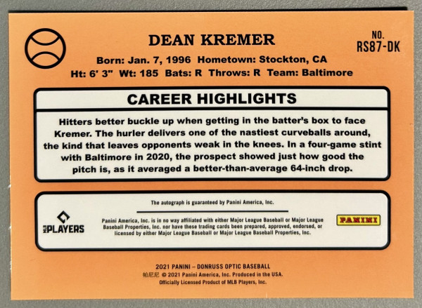 Enhance your collection with the 2021 Donruss Optic Dean Kremer Retro 1987 Auto Rookie Card #RS87-DK. This trading card features the up-and-coming Baltimore Orioles pitcher, capturing the essence of his rookie season. Complete with an authentic autograph from Dean Kremer himself, this card is a must-have for fans and collectors alike.