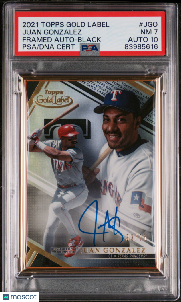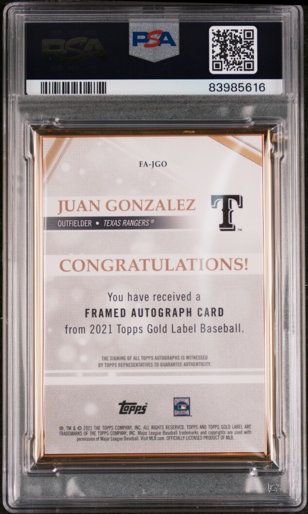 You are purchasing a 2021 Topps Gold Label Framed Auto Juan Gonzalez #JGO Black 33/75 PSA 7 Auto 10. Thank you for looking.