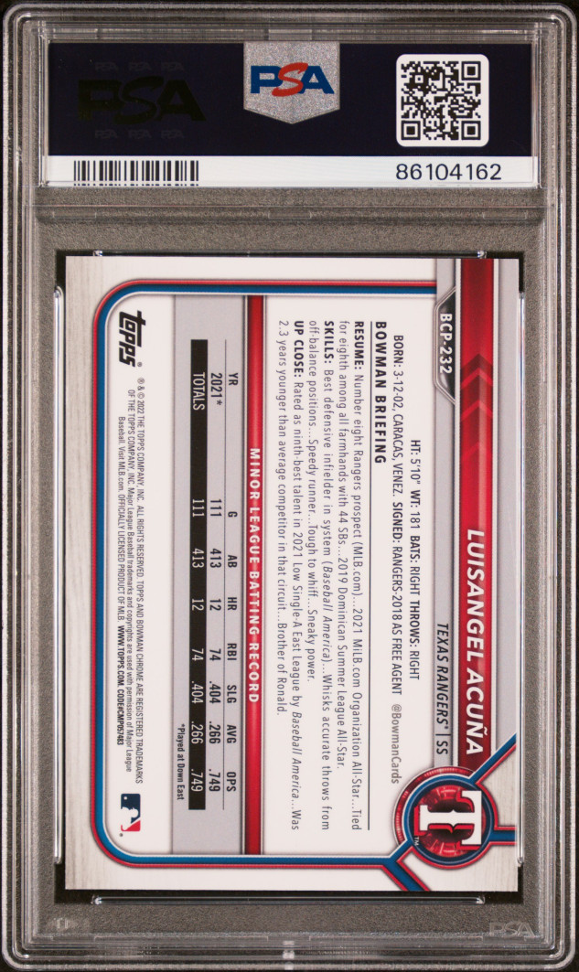 Luisangel Acuna 2 Chrome. Graded PSA 9.022 Bowman