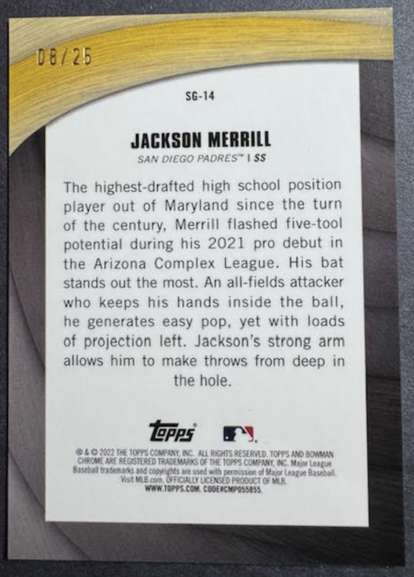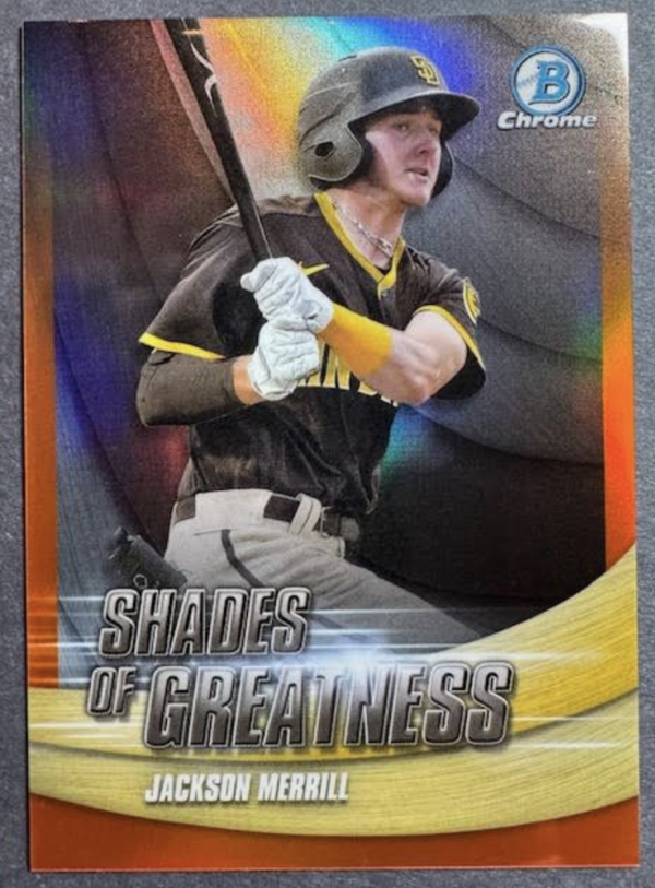 2022 Bowman Chrome Shades of Greatness Jackson Merrill ORANGE #/25 Padres RARE $