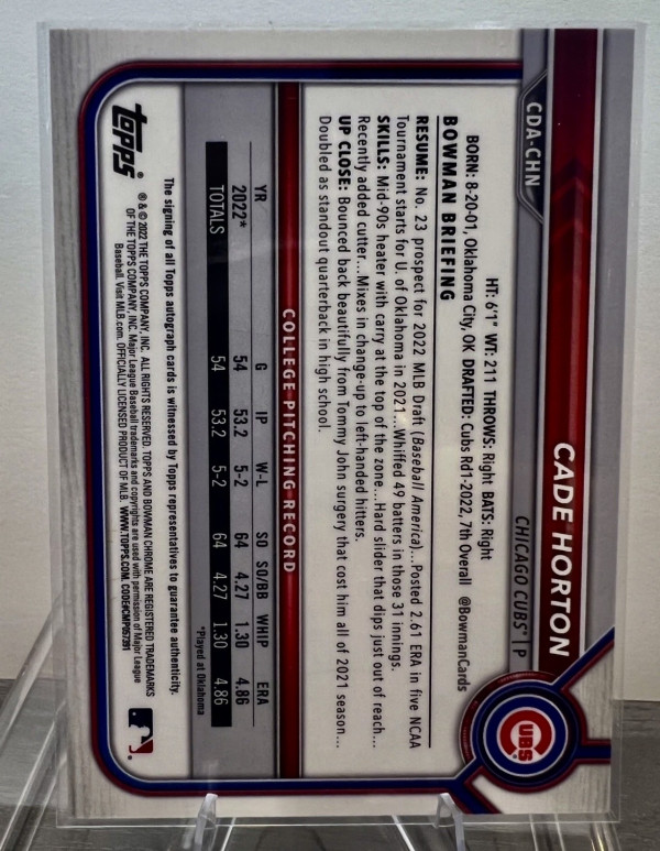 2022 Bowman Draft Cade Horton Chrome Auto 1st Purple /250 #CDA-CHN Autograph