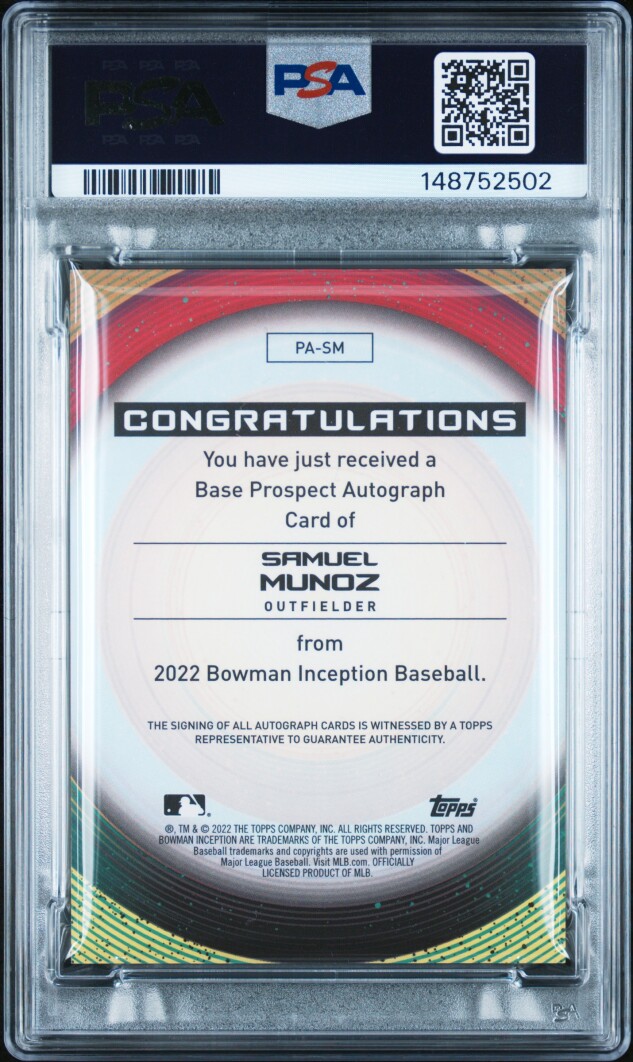 You are purchasing a 2022 Bowman Inception Samuel Munoz #PASM Orange Auto /25 PSA 10. Thank you for looking.