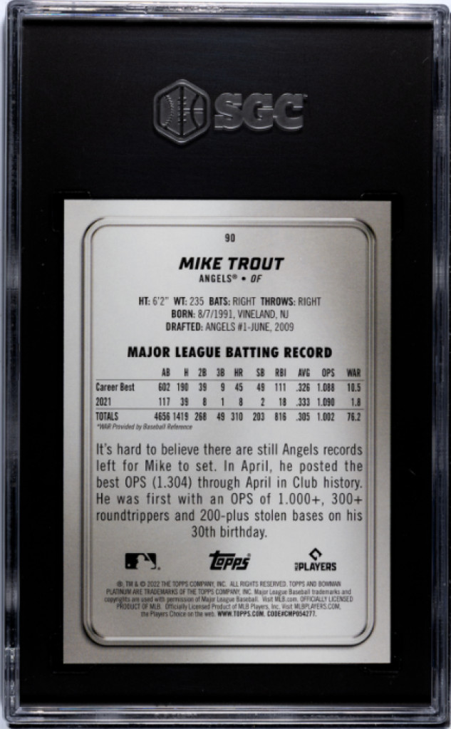 2022 Bowman Platinum Mike Trout /199 SGC 9