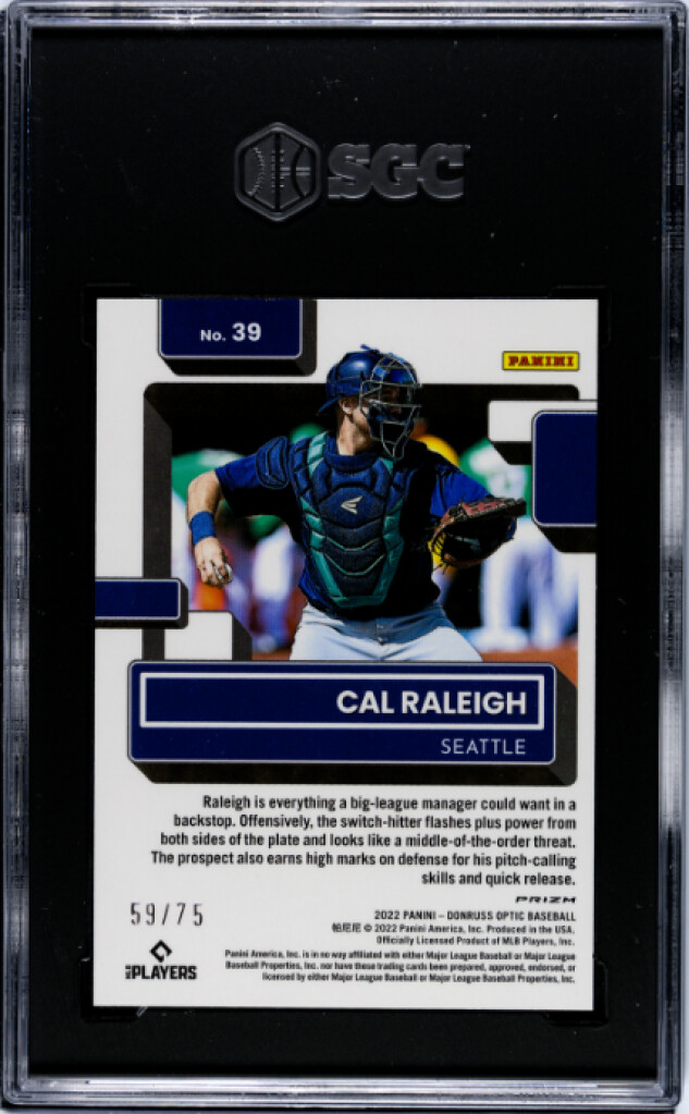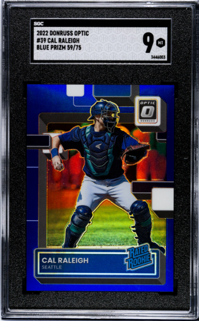 You are purchasing a 2022 DONRUSS OPTIC #39 CAL RALEIGH BLUE PRIZM 59/75 SGC 9 (POP 1). Upon purchase you will receive the exact card pictured. Thanks!