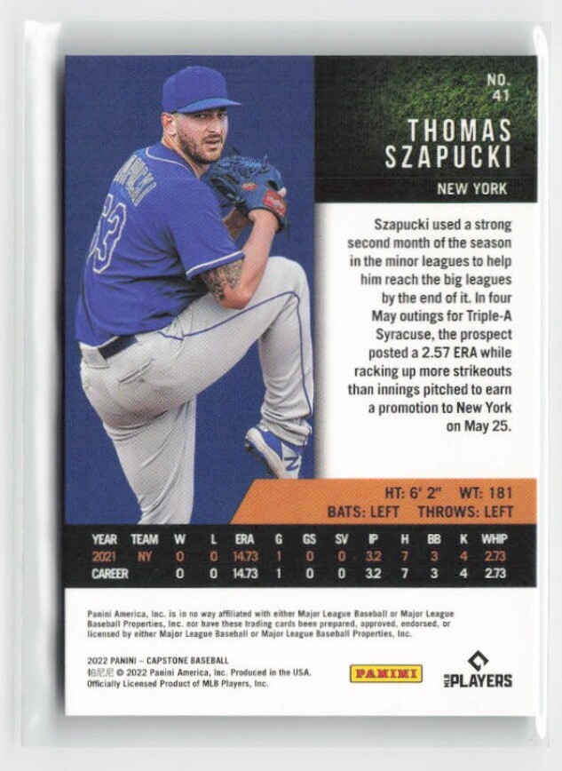 You are purchasing a 2022 Panini Capstone Thomas Szapucki #41 RC. You will receive the exact item in the photographs. Thank you for looking.