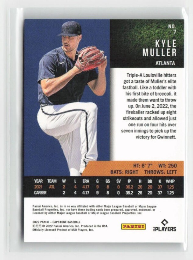 You are purchasing a 2022 Panini Capstone Kyle Muller #7 RC. You will receive the exact item in the photographs. Thank you for looking.