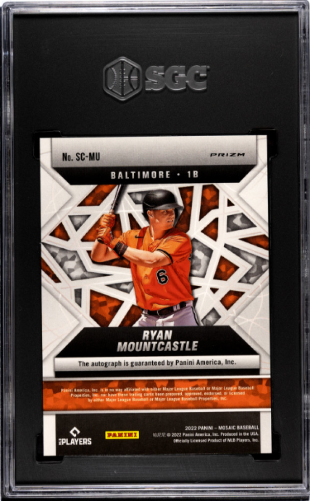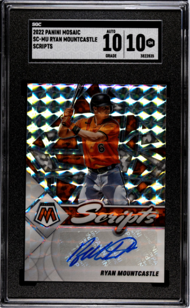 Invest in a "Perfect 10" for your Baltimore collection with this 2022 Panini Mosaic Scripts Ryan Mountcastle #SC-MU, dual-graded SGC 10 Gem Mint for the card and 10 for the crisp, on-card autograph. As a former first-round pick and a proven 30-homer power threat, Mountcastle remains a high-upside cornerstone for the Orioles. After an injury-riddled 2025, he recently finalized a deal to stay in Baltimore for 2026, positioning him as a premier candidate for a major bounce-back season. This pristine, high-grade signature is a must-have for collectors looking to buy low on a Silver Slugger-caliber talent before his stock rises again this spring!