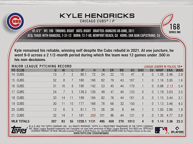 You are purchasing a 2022 Topps Kyle Hendricks #168. You will receive the exact item in the photographs. Thank you for looking.