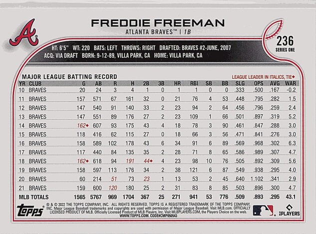 You are purchasing a 2022 Topps 1st Edition Freddie Freeman #236. You will receive the exact item in the photographs. Thank you for looking.