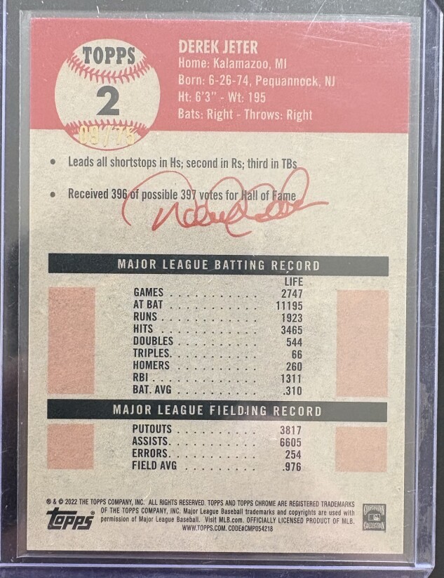2022 Topps Chrome Platinum Derek Jeter #2 Rose Gold Mini Diamond /75