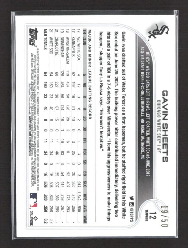You are purchasing a 2022 Topps Chrome Sapphire Edition Gavin Sheets #12 Orange RC 19/50. You will receive the exact item in the photographs. Thank you for looking.