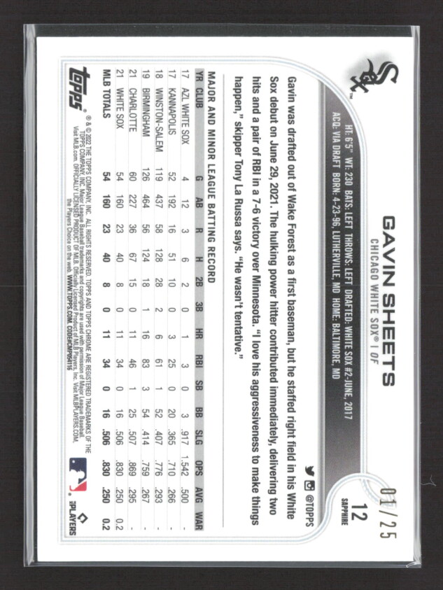 You are purchasing a 2022 Topps Chrome Sapphire Edition Gavin Sheets #12 Red RC 01/25. You will receive the exact item in the photographs. Thank you for looking.