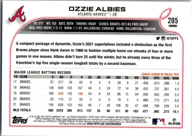 This is a nice example of a 2022 Topps Chrome Sonic #205 Ozzie Albies
