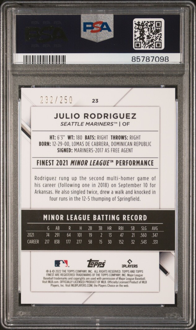 2022 Topps Finest Julio Rodriguez Blue Aqua Vapor Refractor /250 PSA 10