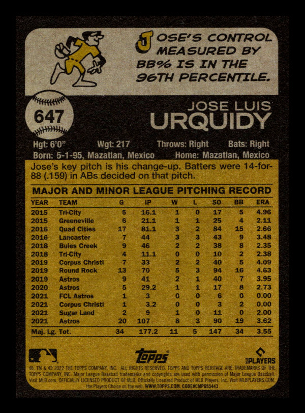 You are purchasing a 2022 Topps Heritage High Number Jose Urquidy #647. You will receive the exact item in the photograph/scan. Thank you for looking.
