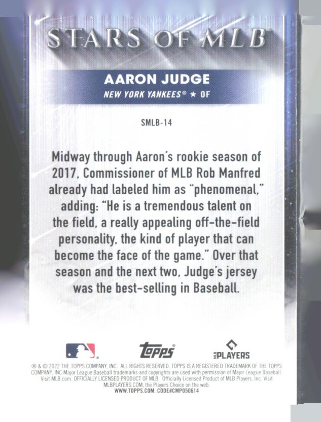 You are purchasing a 2022 Topps Aaron Judge #SMLB-14 Stars of MLB. You will receive the exact item in the photographs. Thank you for looking.
